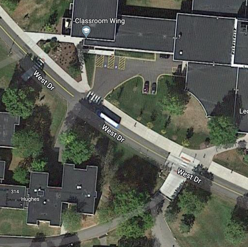 Below upper left shows the proximity of Hughes to the Classroom Wing and the Lecture Hall Building. In the upper right you can see -- just to the right of of the rd parking sign, the window to my room -- 22a -- in the corner, on the wall perpendicular to the parking lot and directly behind the blue parking sign. The two shots on the bottom row are shots of that backdoor Hughes entrance/exit, taken from two slightly different angles.
